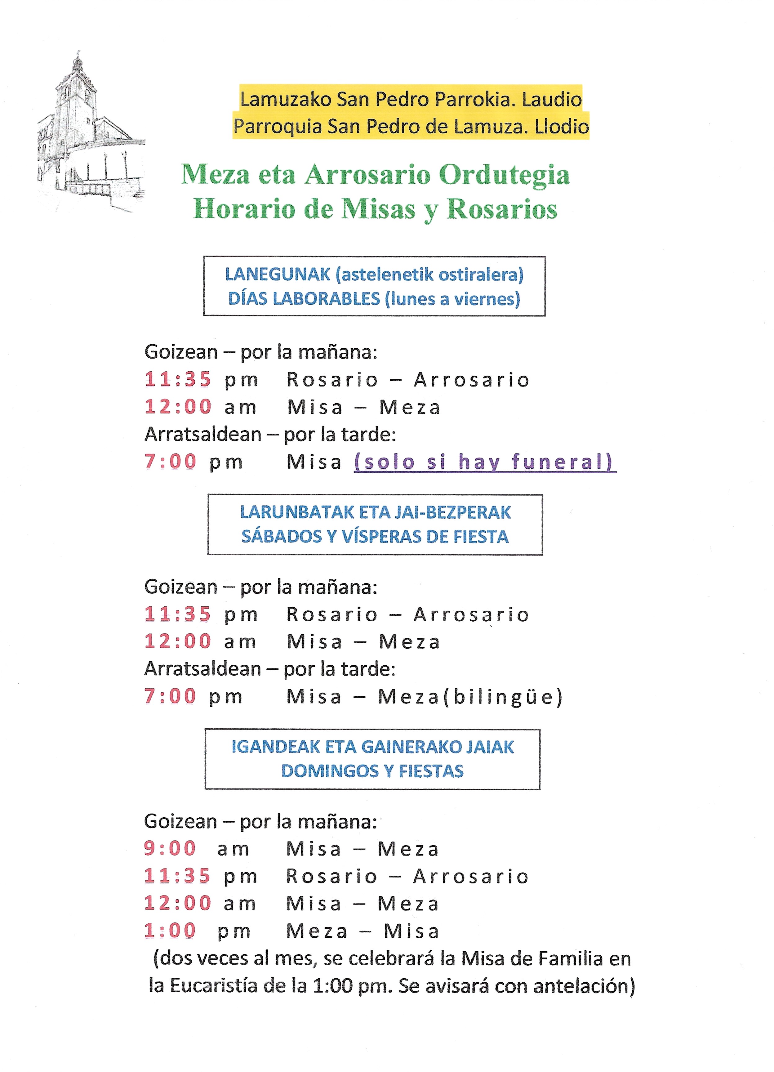 HORARIO DE MISAS – MEZA ORDUTEGIA